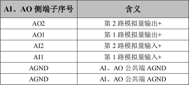 下方兩排端子排的左側(cè)為AI和AO端子排,分別為AI1~AI2兩個模擬量輸入點,AO1~AO2兩個模擬量輸出點,以及2個模擬量的公共端AGND接口(2個AGND口內(nèi)部已短接),如圖所示。AI、AO及AGND端子對應(yīng)的序號及其含義如表2.6所示。