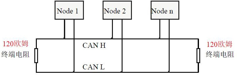 為了增強CAN通訊的可靠性,消除CAN總線終端信號反射干擾,CAN總線網(wǎng)絡(luò)最遠的兩個端點通常要加入終端匹配電阻,如圖3.3所示。終端匹配電阻的值由傳輸電纜的特性阻抗所決定。例如雙絞線的特性阻抗為120Ω,則總線上的兩個端點也應(yīng)集成120Ω終端電阻。如果網(wǎng)絡(luò)上其他節(jié)點使用不同的收發(fā)器,則終端電阻須另外計算。