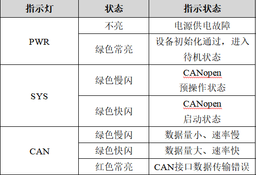 GCAN-4068模塊具有1個(gè)SYS指示燈、1個(gè)PWR指示燈、1個(gè)CAN指示燈來(lái)指示設(shè)備的運(yùn)行狀態(tài)。這3種指示燈的具體指示功能及狀態(tài)如表所示。