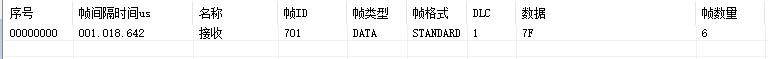 例如:GCAN-4068的Node ID為1(以下節(jié)點(diǎn)號(hào)均為1),則主站設(shè)備可接收到一條節(jié)點(diǎn)狀態(tài)數(shù)據(jù),幀ID為0x701,幀數(shù)據(jù)為0x7F。