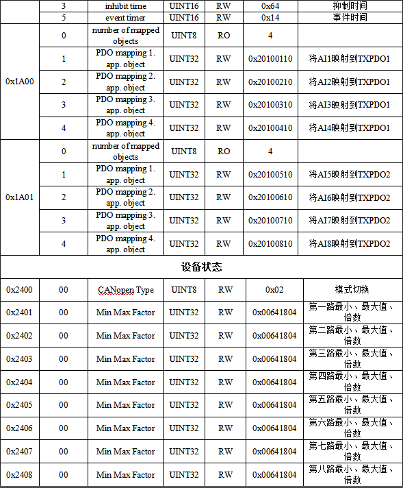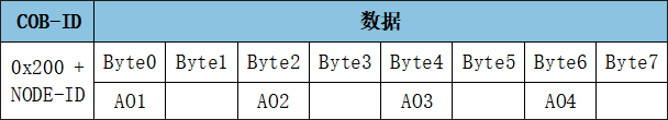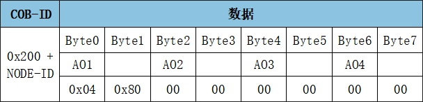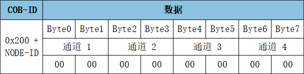 當(dāng)前狀態(tài),RPDO用于表示控制(寫入)通道的狀態(tài),共有2個(gè)RPDO。其中RPDO1代表前4個(gè)通道,幀ID為0x180+Node ID。TPDO2代表后4個(gè)通道,幀ID為0x280+Node ID。