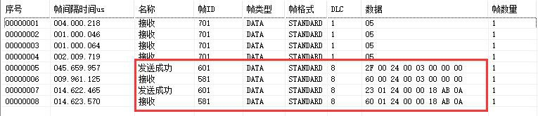 報(bào)文:ID:0x601數(shù)據(jù):23 01 24 00 00 18 AB 0A,設(shè)置第1路輸出最小值為0,即16進(jìn)制的0x00;最大值為24,即16進(jìn)制的0x18;倍數(shù)為2730,即16進(jìn)制的0x0A AB。