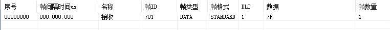 例如:默認(rèn)GCAN-4128的Node ID為1(以下節(jié)點(diǎn)號(hào)均為1),則主站設(shè)備可接收到一條節(jié)點(diǎn)狀態(tài)數(shù)據(jù),幀ID為0x701,幀數(shù)據(jù)為0x7F。