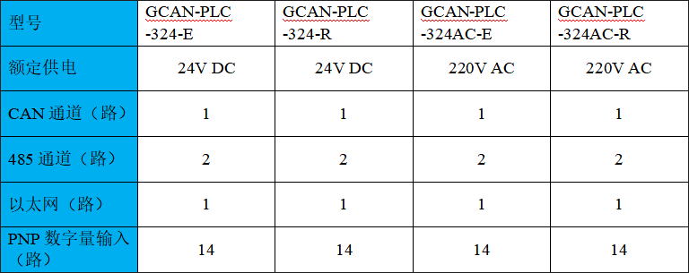 GCAN-PLC-324-E/R系列為滿足多種使用場景,設(shè)計為2種供電方式,直流供電型號:GCAN-PLC-324-E/R,交流供電型號GCAN-PLC-324AC-E/R。