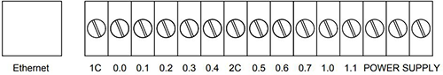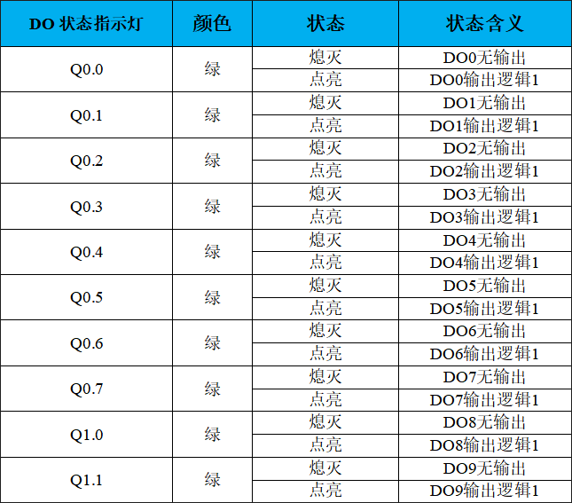 GCAN-PLC-324E/R系列的主控模塊含有上下兩排端子排,上方端子排包含一個RJ45接口和DO端子排,DO端子排分別為Q0.0~Q0.7,Q1.0~Q1.1共10個數(shù)字量輸出點,其中DO0、DO1為PNP數(shù)字量輸出及PWM高速脈沖輸出復(fù)用接口,以及供電接口,如圖所示。