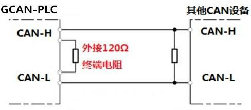 請注意:GCAN-PLC-324E/R系列模塊的CAN總線內(nèi)部未集成120Ω終端電阻。如果節(jié)點數(shù)目大于2,中間節(jié)點不需要安裝120Ω的終端電阻。需要使用時,將電阻兩端分別接入CAN_H、CAN_L即可,如上圖所示。