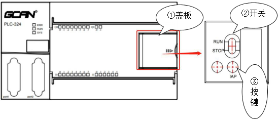 GCAN-PLC-324E/R提供1個程序運行開關(guān)和1個復(fù)位按鈕。打開圖示蓋板后開關(guān)及按鍵位置如圖所示。