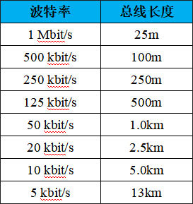 請注意:CAN-bus電纜可以使用普通雙絞線、屏蔽雙絞線。理論最大通信距離主要取決于總線波特率,最大總線長度和波特率關(guān)系詳見下表。若通訊距離超過1km,應(yīng)保證線的截面積大于Φ1.0mm2,具體規(guī)格應(yīng)根據(jù)距離而定,常規(guī)是隨距離的加長而適當(dāng)加大。