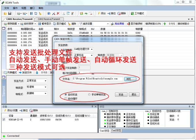 ECAN Tools軟件是我公司自主開發(fā)的調(diào)試軟件,通過軟件可以快速進行CAN總線數(shù)據(jù)收發(fā),實現(xiàn)PC到CAN2.0A和CAN2.0B(包括標準幀、擴展幀、數(shù)據(jù)幀、遠程幀)的雙向通訊。