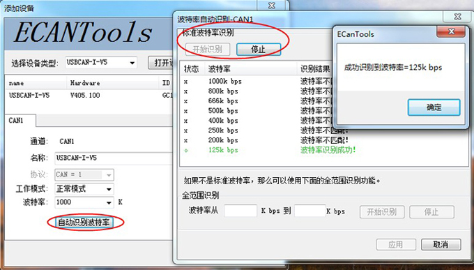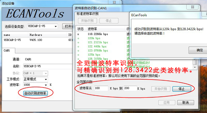 軟件可以自動識別波特率,當用戶在不知道總線波特率的時候,自動識別波特率功能會對用戶有極大的幫助。識別波特率分為兩種模式:標準波特率識別(通用波特率如1000K、800K、500K等)、全范圍波特率識別(設(shè)置識別范圍,全面匹配)