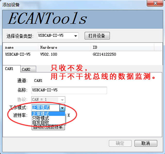 可以設(shè)置USBCAN只聽模式,在這種模式下,設(shè)備只是接收can總線上的數(shù)據(jù),不向總線發(fā)送回應(yīng)數(shù)據(jù)包,適合于在正在運行的系統(tǒng)中,截獲總線數(shù)據(jù)進行分析。