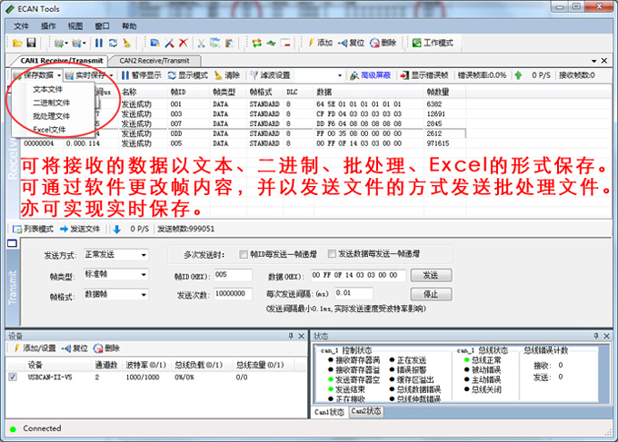 可將列表中的數(shù)據(jù)(實時)保存到電腦,可以有多種保存格式:文本文件(.txt)數(shù)據(jù)直觀便于攜帶;二進制文件可以滿足用戶的特殊需求;批處理文件(.CAN)可以修改后發(fā)送回總線上;Excel文件可以使用excel打開,便于數(shù)據(jù)處理。