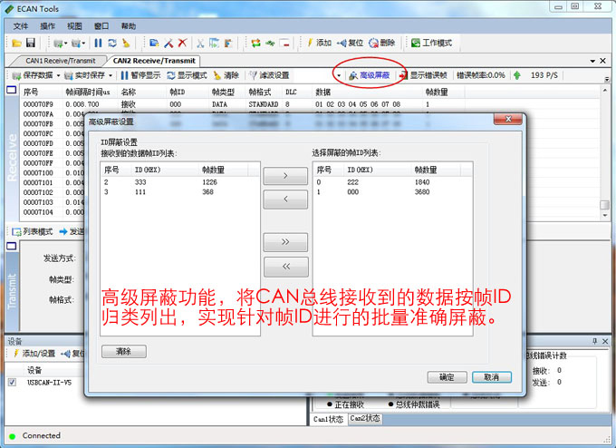軟件接收可以屏蔽指定的幀數(shù)據(jù)。可以將接收到的數(shù)據(jù)按幀ID歸類后合并顯示在左側(cè)的待屏蔽列表中,從左邊的列表中選擇您需要屏蔽的幀ID,點擊向右箭頭即可將選中的幀ID添加到屏蔽列表中,軟件將自動屏蔽所有在右側(cè)列表中所有以此幀ID開頭的所有數(shù)據(jù),屏蔽列表可以設(shè)置多條。此功能非常便于汽車CAN數(shù)據(jù)抓取,可以屏蔽怠速狀態(tài)下的所有數(shù)據(jù)后直觀的看到新增加的數(shù)據(jù),用于判斷數(shù)據(jù)作用。請注意:CANCore-I為1條CAN總線的模塊,僅有CAN1可用;CANCore-II為2條CAN總線的模塊,CAN1、CAN2均可用。